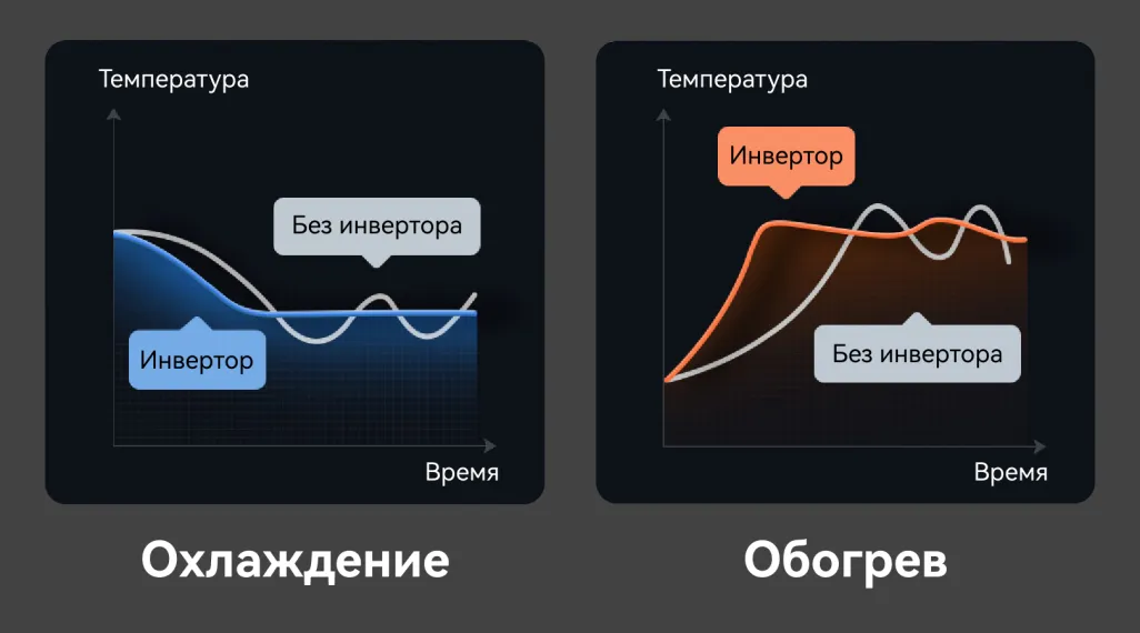 Инверторная конструкция позволяет автономно поддерживать температуру на заданном уровне: после достижения установленного значения, кондиционер автоматически поддерживает стабильную и экономичную работу, повышая эффективность и продлевая срок службы устройства.